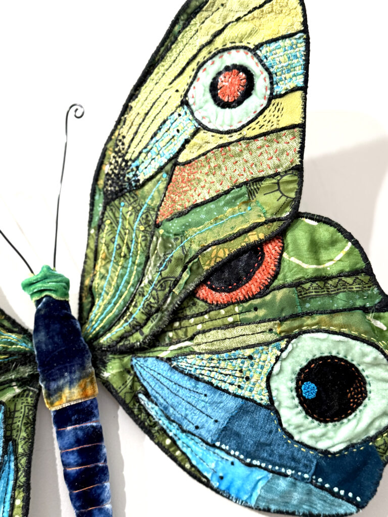 Once you’ve added all your fabric, essential embroidery stitches—including backstitch, running stitch, seed stitch, and French knots—will be demonstrated and used to embellish and enhance your sculpture. Once the wings are complete, they’ll be cut out and assembled with wire. Additional fabric and fiber will be used to create and attach the butterfly’s body, bringing the piece fully to life.