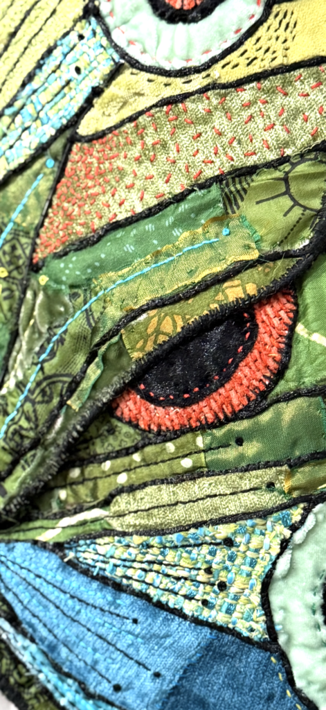 No fancy supplies are needed—just imagination and a willingness to explore. Using basic sewing stitches, wire, black cord, colorful reclaimed fabrics, and freehand embroidery, you’ll create a richly textured fiber sculpture full of character and charm, entirely your own.
